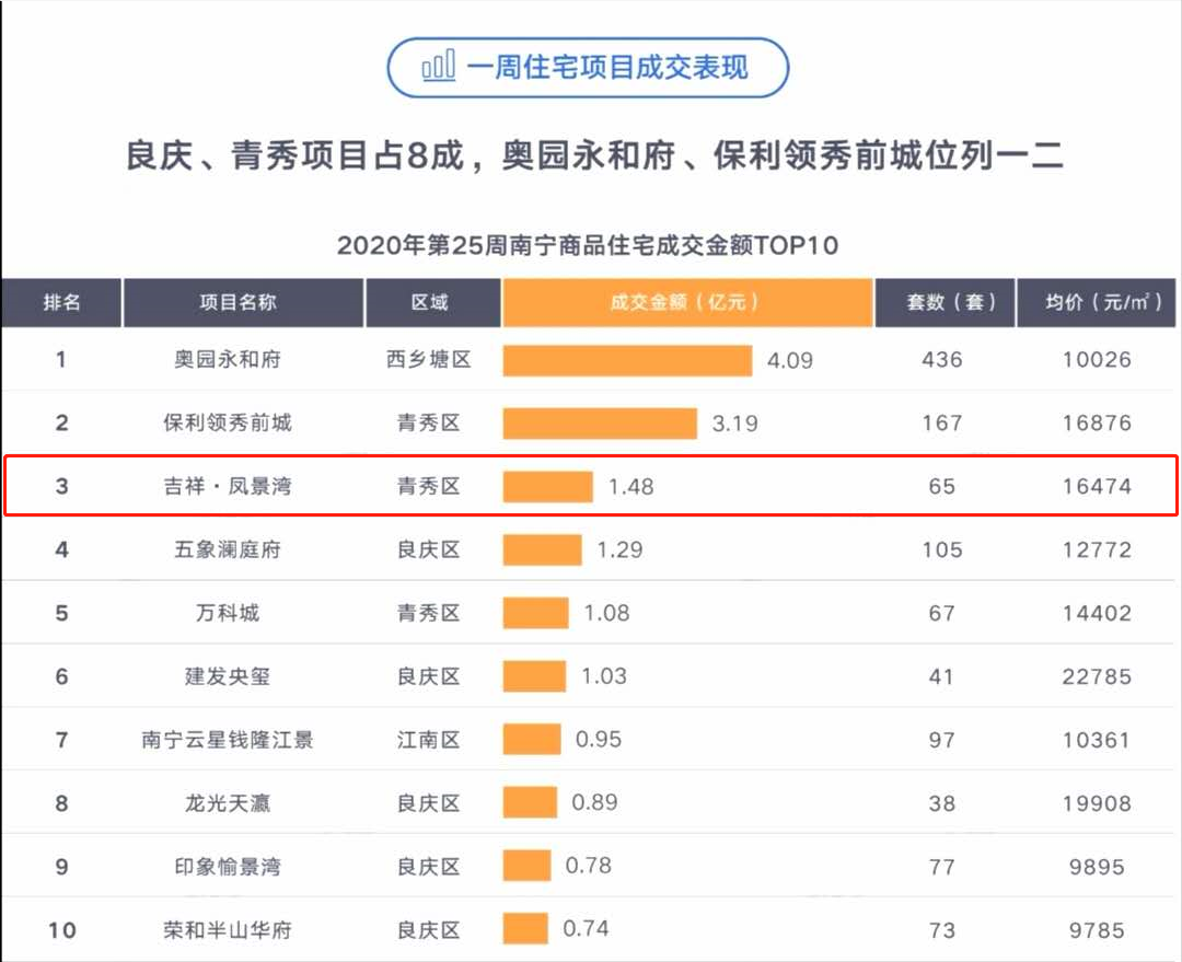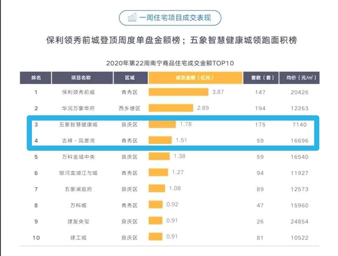 其中,南寧兩個在售項目成績搶眼,吉祥·鳳景灣、五象智慧健康城銷售額多次榮登南寧區域單周、月度榜單T0P10。北海、防城港銷售逆勢而上,北海北投觀海灣、防城港·鳳景灣二期相繼在今年4月入市銷售。在北海當地市場低迷形勢下,北海觀海一品和北投觀海灣兩個項目,在6月份仍然取得銷售80套的好成績;防城港·鳳景灣二期10#樓更是越戰越勇,在防城港市場緩慢復蘇的不利情形下,開盤以來仍然取得銷售超過50套的好業績。