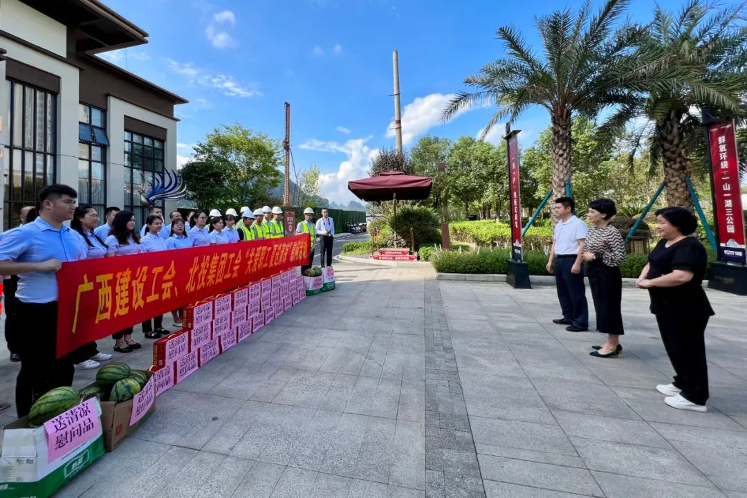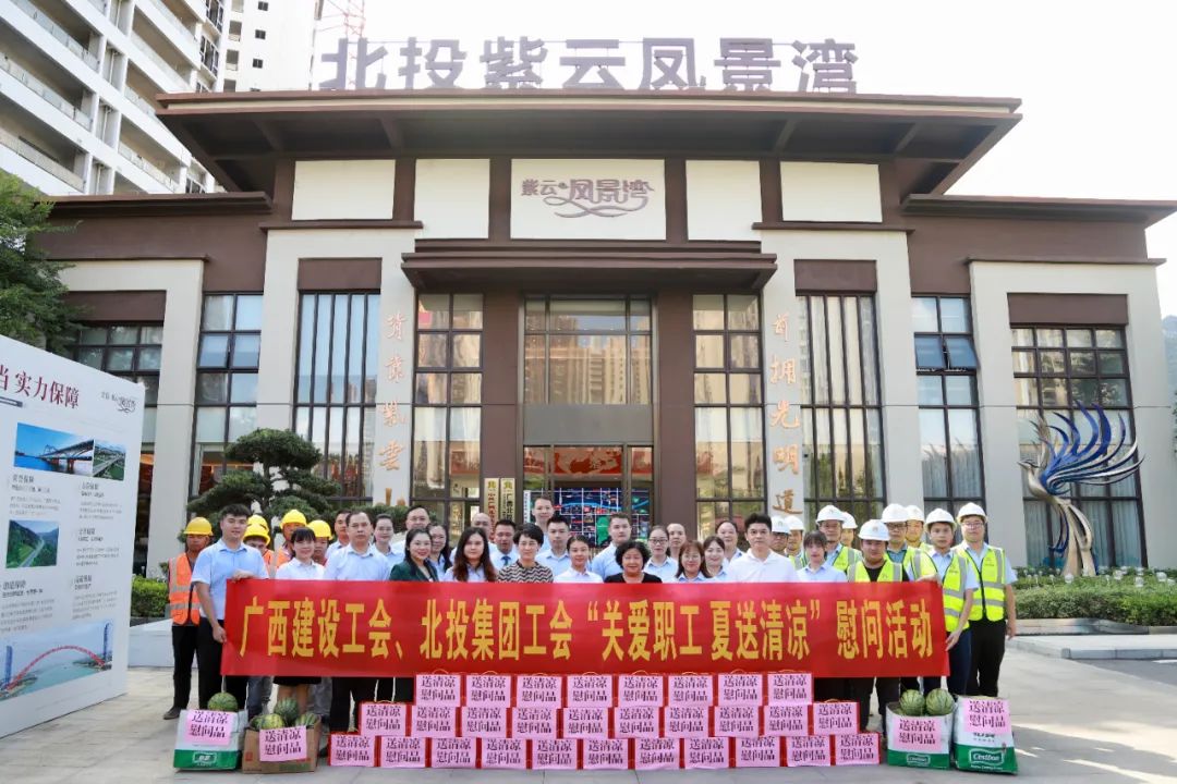 8月19日上午,廣西建設工會副主任(主持工作)鄒麗萍、北投集團工會副主席呂兢一行到北投產城集團旗下賀州北投紫云鳳景灣項目開展“關愛職工 夏送清涼”慰問活動。廣西交通工會(海員工會)主席廖紅梅一同參加慰問活動。